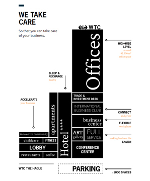 WTC The Hague aspires to offer a unique regional platform for international business. A fully integrated complex including WTC The Hague Offices, WTC The Hague Business Center, WTC The Hague Congress Center and WTC The Hague Plaza, our organization offers a physical meeting place where local entrepreneurs, as well as regional and international organizations can meet, socialize and network. The position of WTC The Hague as the center of the international platform is continuing to grow, and as a direct result, companies chose to be part of the WTC with continuously more international events hosted by our organization. Due to its strong partners this WTC is well positioned for enquiries regarding international trade and investments. WTC The Hague will be the starting point for many incoming and outgoing trade and investment missions.