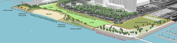 To be developed in phases, the first phase will focus on the northwest shoreline improvements including: