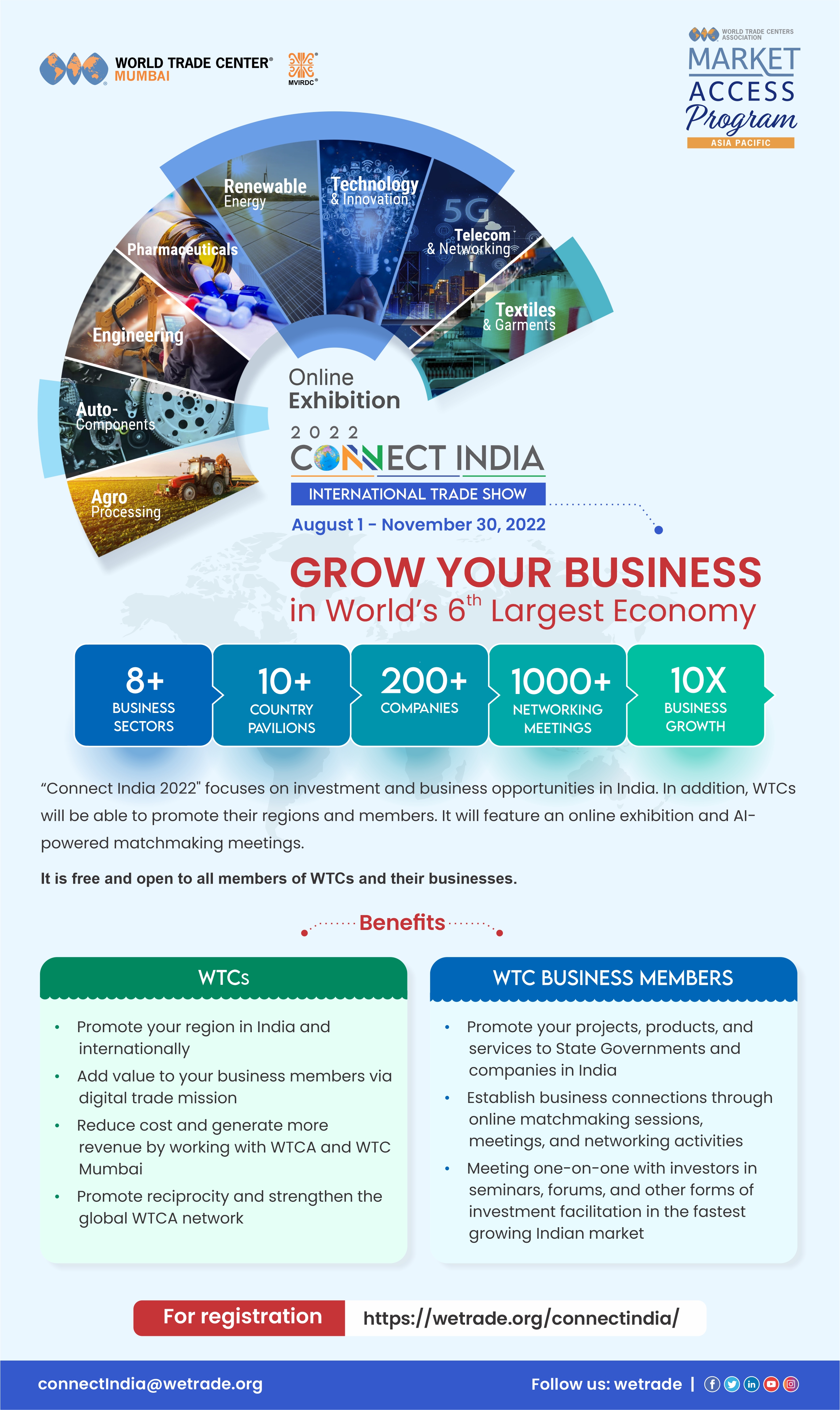 Connect India trade show, hosted by WTC Mumbai. Featuring access to multiple industries across the India market -- event to be held August 1 – December 3, 2022 via online B2B trade show and virtual meetings, and in Mumbai, India.
